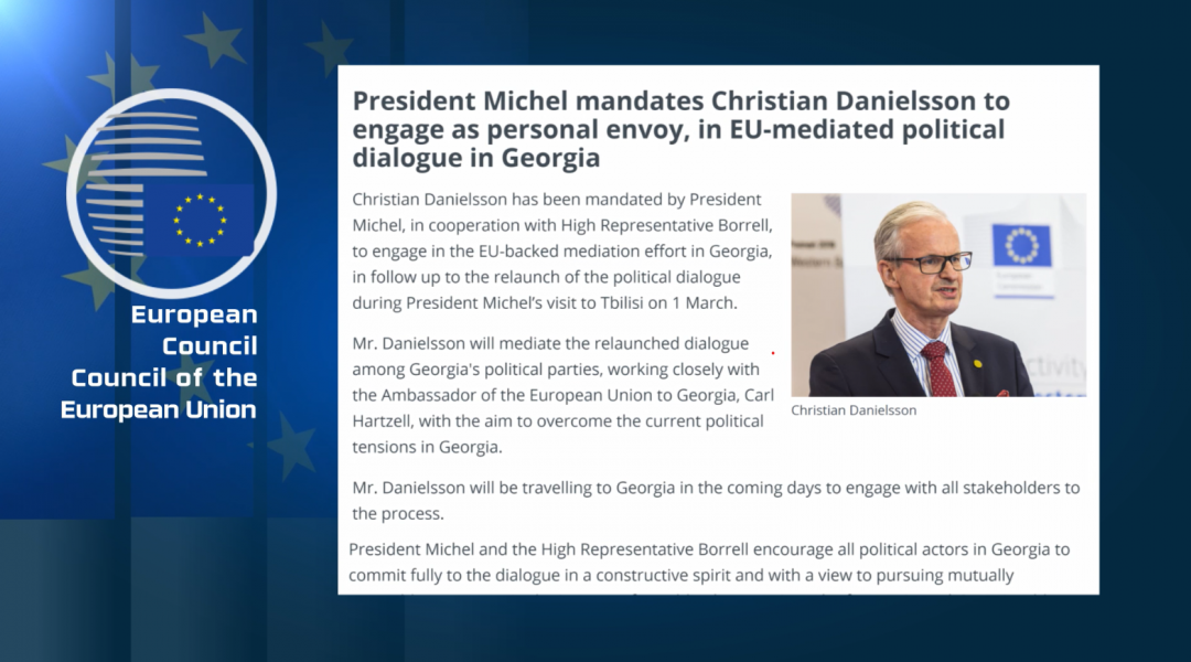 პოლიტიკური დიალოგის მედიაციისთვის ევროპული საბჭოს პრეზიდენტი, შარლ მიშელი, საქართველოში პირად წარმომადგენელს აგზავნის. მან ევროკავშირის უმაღლეს წარმომადგენელთან, ჟოზეფ ბორელთან შეთანხმებით, საქართველოში ევროკავშირის მიერ მხარდაჭერილი პოლიტიკური დიალოგის მედიატორად კრისტიან დანიელსონი დანიშნა. ევროკავშირის საბჭოს მიერ გავრცელებულ განცხადებაში წერია, რომ კრისტიან დანიელსონი მჭიდროდ ითანამშრომლებს საქართველოში ევროკავშირის ელჩთან, კარლ ჰარცელთან. ამ ფაქტს ოპოზიციური პარტიების წარმომადგენლები გამოეხმაურნენ.