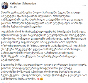 ვფიქრობ, რომ ზემოხსენებულ ფაქტებს სჭირდება შესწავლა, შესაბამისად უნდა ჩატარდეს სრულყოფილი და ობიექტური გამოძიება, რომელიც დაადგენს სიმართლეს. აღნიშნულიდან გამომდინარე, საგამოძიებო პროცესის მიმართ ნდობის უზრუნველყოფის მიზნით, ვტოვებ თანამდებობას! ვფიქრობ, ეს იქნება პრეცედენტი ყველა თანამდებობის პირისათვის, საზოგადოებაში ობიექტურად გაჩენილი კითხვების შემთხვევაში იმოქმედოს პასუხისმგებლობის მაღალი სტანდარტით.