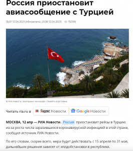 რუსული მედიის ინფორმაციით, ამ ეტაპისთვის რეისები 15 აპრილიდან 31 მაისამდე შეჩერდება. ამის მიზეზად მოსკოვში თურქეთში გაუარესებულ ეპიდსიტუაციას ასახელებენ. თუმცა შენარჩუნდება სტამბოლსა და მოსკოვს შორის კვირაში 2 რეგულარული ავიარეისი.