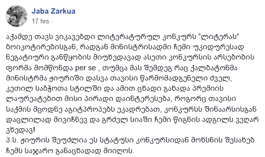 ლიტერატურულ პრემია „ლიტერას“ მონაწილეები და ჟიურის წევრები ტოვებენ. ავტორებმა პროტესტი მასობრივად მას შემდეგ გამოაცხადეს, რაც ცნობილი გახდა, რომ ჟიურის 5 წევრიდან ერთს კულტურის სამინისტრო ნიშნავდა. უფრო მეტ დეტალს ამასთან დაკავშირებით ანეტ მიქელაძე გვეტყვის რუბრიკაში „კუბი“.