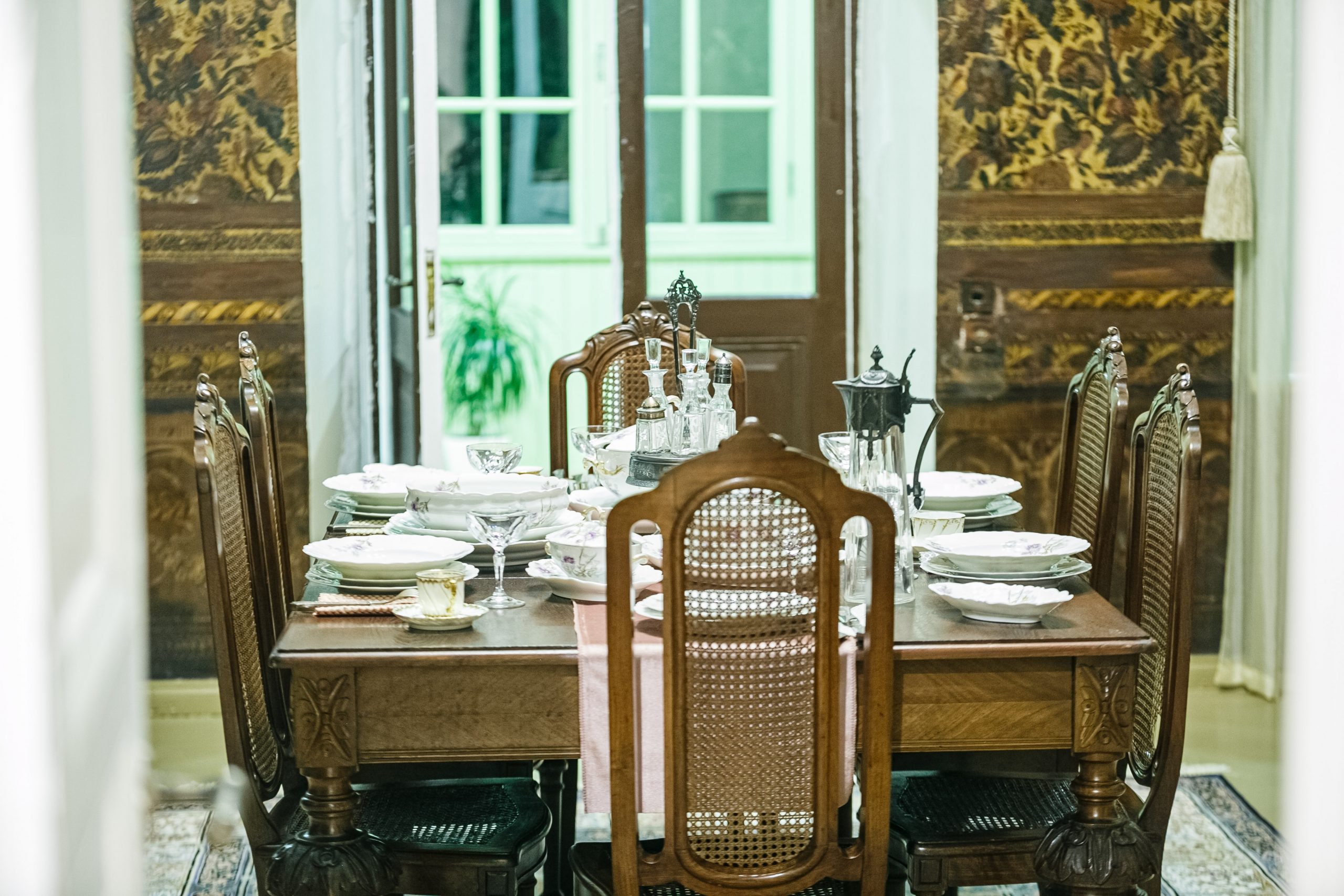 მისაღებიდან სასადილო ოთახში გადავინაცვლეთ. აქ პირვანდელი სახით არის შენარჩუნებული ოთახის შპალერი და ავეჯი.