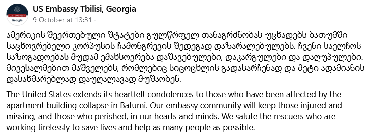 საცხოვრებელი სახლის ჩამონგრევასთან დაკავშირებით საქართველოს სამძიმარს უცხადებენ საელჩოები. ამერიკის შეერთებული შტატების საელჩო თავის ფეისბუკზე წერს: