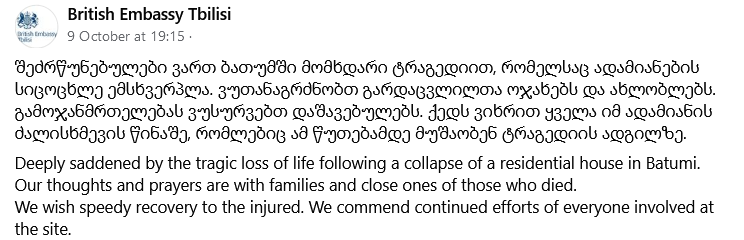 „შეძრწუნებული ვართ ბათუმში მომხდარი ტრაგედიით, რომელსაც ადამიანების სიცოცხლე ემსხვერპლა. თანავუგრძნობთ გარდაცვლილთა ოჯახებსა და ახლობლებს. გამოჯანმრთელებას ვუსურვებთ დაშავებულებს. ქედს ვიხრით ყველა იმ ადამიანის ძალისხმევის წინაშე, რომლებიც ამ წუთებამდე მუშაობენ ტრაგედიის ადგილზე“, – ნათქვამია ბრიტანეთის საელჩოს განცხადებაში.