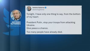 გაეროს გენერალური მდივანი ანტონიო გუტერეში უკრაინაში სამხედრო მოქმედებების დაწყებას გამოეხმაურა. ანტონიო გუტერეში მიმართავს პრეზიდენტს პუტინს, შეაჩეროს ჯარები უკრაინაში თავდასხმისგან და მისცეს მშვიდობას შანსი.