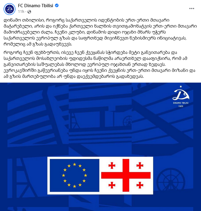 პარლამენტში ე.წ. აგენტების კანონპროექტის განხილვების პარალელურად “დინამო თბილისმა” ოფიციალურ ფეისბუკგვერდზე პოსტი გამოაქვეყნა, სადაც წერს რომ მხარს უჭერს საქართველოს ევროპულ გზას და რომ საფრთხედ მიიჩნევენ ნებისმიერ ინიციატივას, რომელიც ამ გზას გადაუხვევს.
