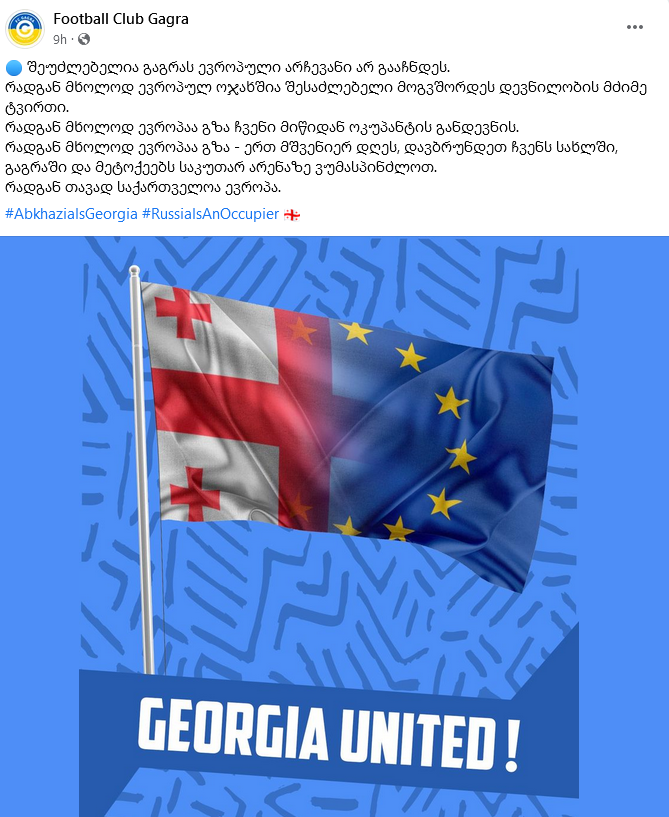 რადგან მხოლოდ ევროპაა გზა – ერთ მშვენიერ დღეს, დავბრუნდეთ ჩვენს სახლში, გაგრაში და მეტოქეებს საკუთარ არენაზე ვუმასპინძლოთ. რადგან თავად საქართველოა ევროპა” – ვკითხულობთ პოსტში.