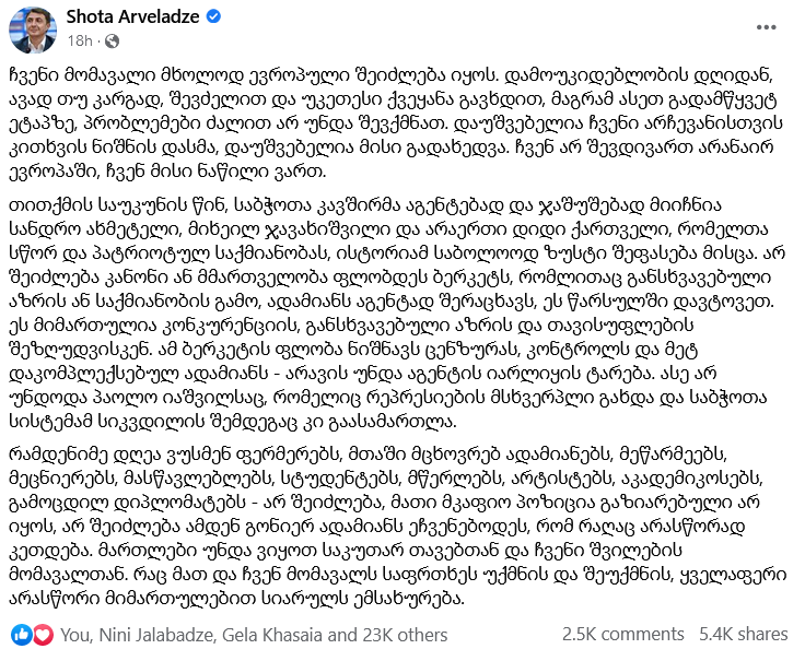 და ასევე ფეისბუკზე კომენტარი გააკეთა ყოფილმა ფეხბურთელმა შოთა არველაძემ, რომელმაც პოსტი დაახლოებით 18 საათის წინ დაიდო და ფეისბუკზე 23 ათასზე მეტი მოწონება დაიმსახურა.