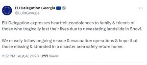 „საქართველოში ევროკავშირის დელეგაცია სამძიმარს უცხადებს შოვში გამანადგურებელი მეწყრის შედეგად ტრაგიკულად დაღუპულთა ოჯახებსა და მეგობრებს. ჩვენ ყურადღებით ვადევნებთ თვალს მიმდინარე სამაშველო და საევაკუაციო ოპერაციას, ვიმედოვნებთ, სტიქიის ზონაში დაკარგული და ჩარჩენილი ადამიანები უვნებლად დაბრუნდებიან სახლებში“, – ნათქვამია ევროკავშირის დელეგაციის განცხადებაში.
