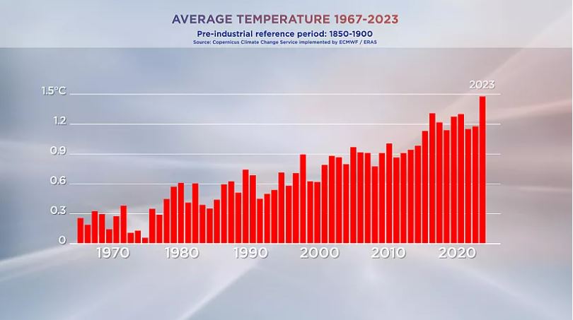 სანამ სლოვენიის წყალდიდობასთან გამკლავების სამზადისზე გადავალთ, კლიმატის ცვლილების მონიტორინგის თანამგზავრული სისტემის Copernicus Climate Change Service-ის ბოლო მონაცემებს გადავხედოთ, რათა გავიგოთ, თუ რა ხდება ჩვენს დამთბარ პლანეტაზე. ამ მონაცემების მიხედვით, შეიძლება დაზუსტებით ითქვას, რომ 2023 წელი მართლაც ყველაზე ცხელი წელი იყო, რაც კი აღნუსხულა. გრაფიკზე, რომელზეც ასახულია 1967 წლიდან მოყოლებული ტემპერატურის წლიური საშუალო მაჩვენებლები, ჩანს, რომ გასულ წელს ჰაერის ტემპერატურა თითქმის ერთ-ნახევარი გრადუს ცელსიუსით აღემატებოდა წინარეინდუსტრიული პერიოდის საშუალო მაჩვენებლებს, რომლებიც 1850-1900 წლებს მოიცავს.