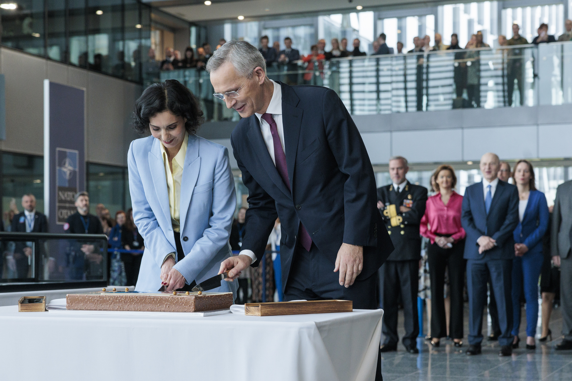 „ჩვენ გვაქვს დიდი პრივილეგია, რომ პირველად გვქონდეს ჩვენი დამფუძნებელი ხელშეკრულება ნატოს შტაბ-ბინაში, ეს არის ვაშინგტონის ხელშეკრულება, ორიგინალი. მე მომწონს ვაშინგტონის ხელშეკრულება. თუნდაც, იმიტომ, რომ ის ძალიან მოკლეა, სულ რაღაც რამდენიმე გვერდი. კაცობრიობის ისტორიაში არასდროს ყოფილა არც ერთი დოკუმენტი, რომელიც ამდენს ნიშნავდა ამდენი ხალხისთვის. დოკუმენტი, რომელსაც მოაქვს ამ მასშტაბის უსაფრთხოება, ამდენი კეთილდღეობა და ამდენი მშვიდობა“, – განაცხადა იენს სტოლტენბერგმა.