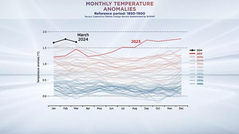 კლიმატის ცვლილების მონიტორინგის თანამგზავრული სისტემის „კოპერნიკუსის“ [Copernicus Climate Change Service] ბოლო მონაცემების მიხედვით, 2024 წლის მარტი გლობალურ დონეზე ყველაზე თბილი თვე იყო, რომლის განმავლობაშიც ჰაერის ტემპერატურა 0.7 გრადუს ცელსიუსით აღემატებოდა 1991-2020 წლების საშუალო მაჩვენებელს.