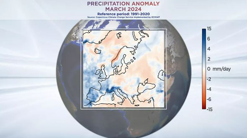 გასული მარტი საშუალოზე უფრო ნალექიანი იყო დასავლეთ ევროპის უმეტეს ნაწილში, განსაკუთრებით საფრანგეთში, ესპანეთსა და პორტუგალიაში. უხვი ნალექი ანომალიური ნალექების რუკაზე ლურჯად არის შეფერილი. შესამჩნევია ისიც, რომ ნორვეგიის სანაპიროსა და აღმოსავლეთ ევროპის გარკვეულ ადგილებში შედარებით მშრალი ამინდი იდგა.