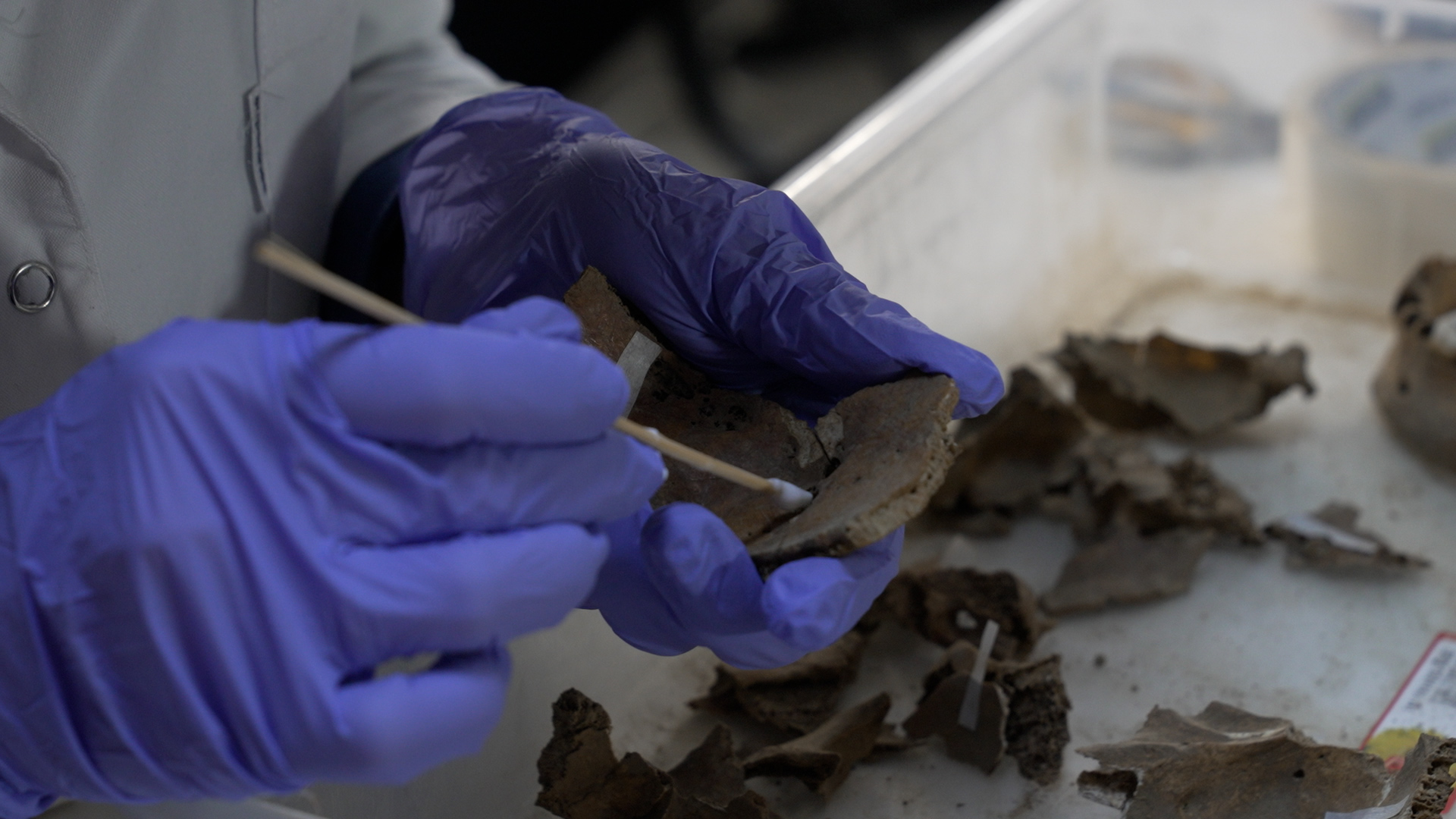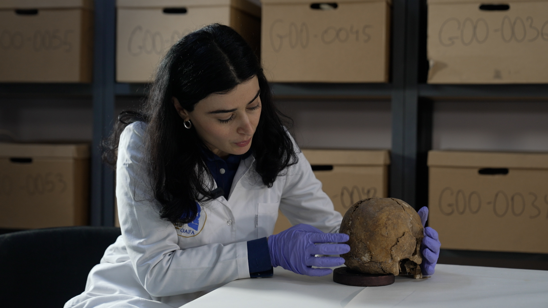 „გვაქვს ორი შემავალი ცეცხლნასროლი დაზიანება. ცეცხლნასროლი დაზიანებისთვის თავის ქალაზე დამახასიათებელია შემდეგი ნიშნები, როდესაც გარე ფირფიტის მახასიათებლებს ვაკვირდებით, აქ მოტეხილობა არის შედარებით გლუვი, იგივე შეგვიძლია ვთქვათ მეორეზეც, რომელიც შედარებით ქვემოთ მდებარეობს, ხოლო შიგნიდან გვაქვს ამოტეხილი ძვლები. სწორედ ამის მეშვეობით შეგვიძლია დავადგინოთ, რომელია შემავალი და რომელი – გამავალი მოტეხილობა. მას შემდეგ, რაც განვსაზღვრავთ შემომავალსა და გამავალს, გვაქვს საშუალება განვსაზღვროთ სროლის ტრაექტორიაც. ამ შემთხვევაში გვაქვს უკნიდან წინა მიმართულებით. მსგავსი ნიშანი დამახასიათებელია სამარხში აღმოჩენილი ნეშტების უმეტესობისთვის. უმეტესობას აქვს მსგავსი მდებარეობა შემავალი და გამომავალი ხვრელების”, – გვიხსნის მერი გონაშვილი, საქართველოს სასამართლო ანთროპოლოგიის ასოციაციის (GAFA) პრეზიდენტი.