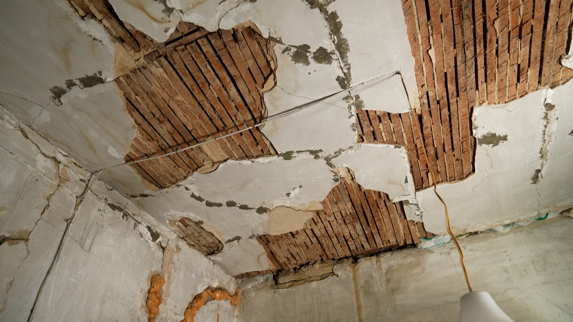 დაზიანებული ჭერი ნაკლები პრობლემაა სველი წერტილის მდგომარეობასთან შედარებით, რომელიც აქ მცხოვრები რამდენიმე ოჯახისთვის საერთოა. ძველი სახლის ეს ნაწილი იმდენად დაზიანებულია, რომ იატაკი ნაწილობრივ ჩავარდა – უზარმაზარი ნახვრეტიდან ახლა ქვედა სართული მოჩანს.