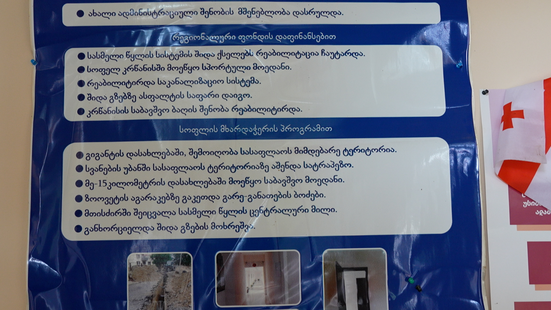 როგორც კედელზე გაკრული ბანერი გვამცნობს, 2015 წელს, სხვა ინფრასტრუქტურულ პროექტებთან ერთად ადგილობრივი ბიუჯეტის დაფინანსებით აქ რეაბილიტაცია ჩაუტარდა სასმელი წყლის სისტემის შიდა ქსელებსაც… ალბათ ეს არის ერთ-ერთი მიზეზი, რომლის გამოც ადგილობრივი მოსახლეობა კიდევ ერთ ახალ პროექტს ეჭვის თვალით უყურებს…